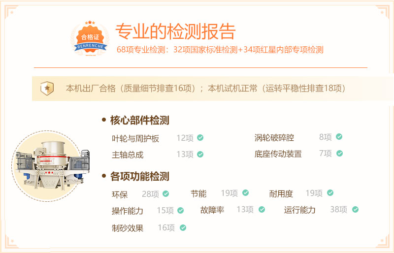 報告表明:第五代環保節能制砂機,經過重重嚴格檢測,各核心零部件均達標,且環保能力強,符合綠色制砂標準,同時耐用度高,設備壽命更長、故障率低;另外,設備日常運行平穩,可全天24小時連續作業無障礙,制成的砂子粒型美觀、級配合理、細度模數可調,在市場上擁有更高價值